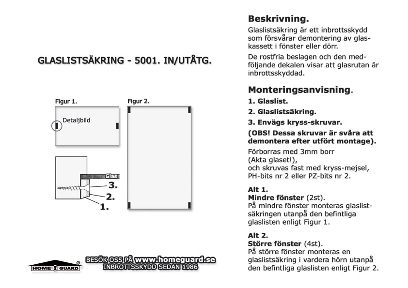 Inbrottsskydd för glaslist monterad på utsidan av fönster eller dörr. Försvårar demontering av glaskassett.